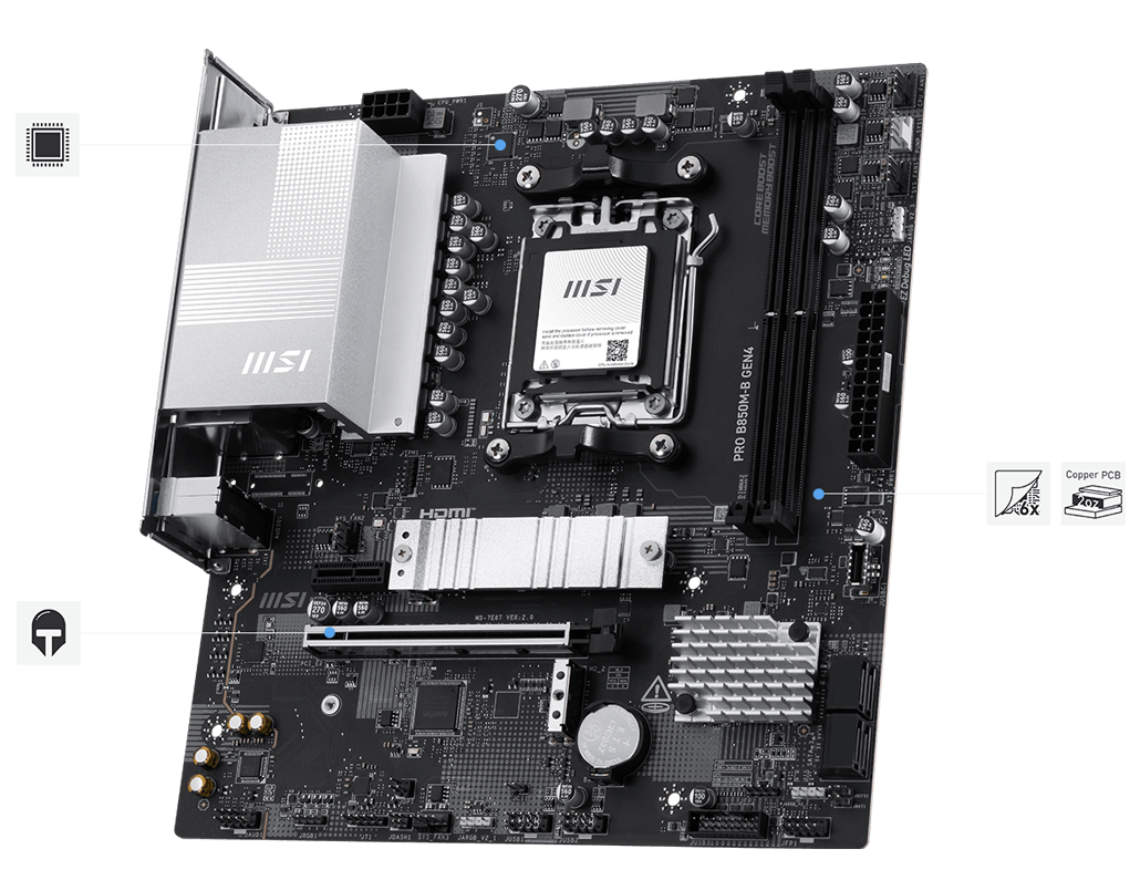 Максимальная производительность благодаря флагманской конструкции VRM с цифровой схемой питания 7+2+1. С 8-контактным разъёмом питания материнская плата PRO B850M-B GEN4 готова справиться с нагрузкой мощных процессоров.